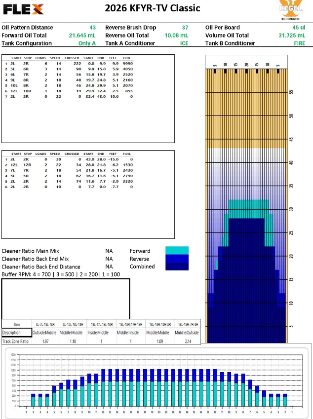 The lane pattern for the 2026 KFYR TV Bowling Classic will be a custom 43-foot pattern with 31.725 mls of oil and a ratio of 2.14-1 on the right and 1.97-1 on the left. The first thing that stands out when looking at this pattern is the 6, 2 to 2 loads of oil. With 6 loads of oil being applied across the lane from 2 on the left to 2 on the right for the first 10 feet, finding friction will be a challenge.